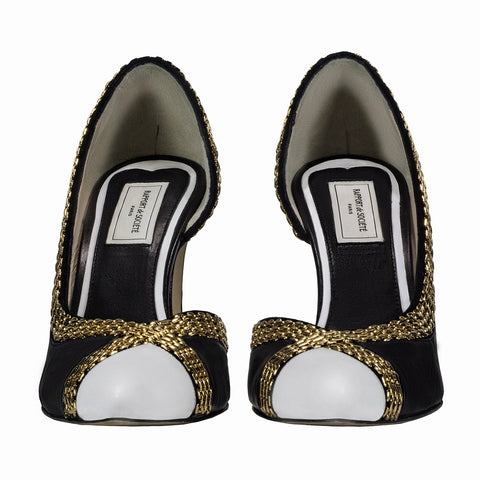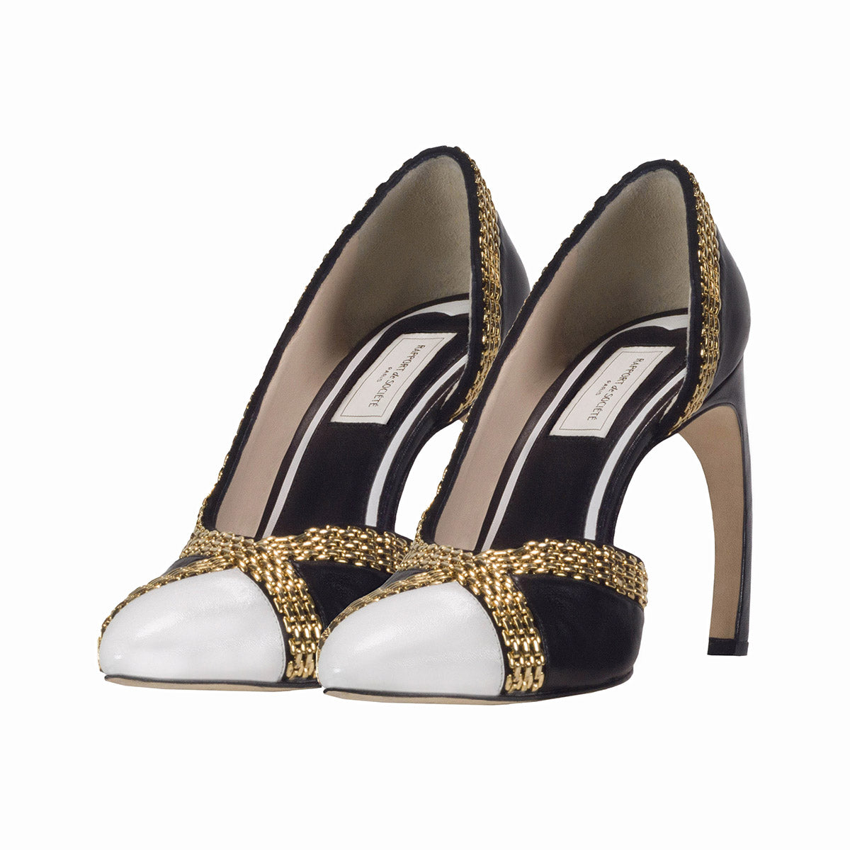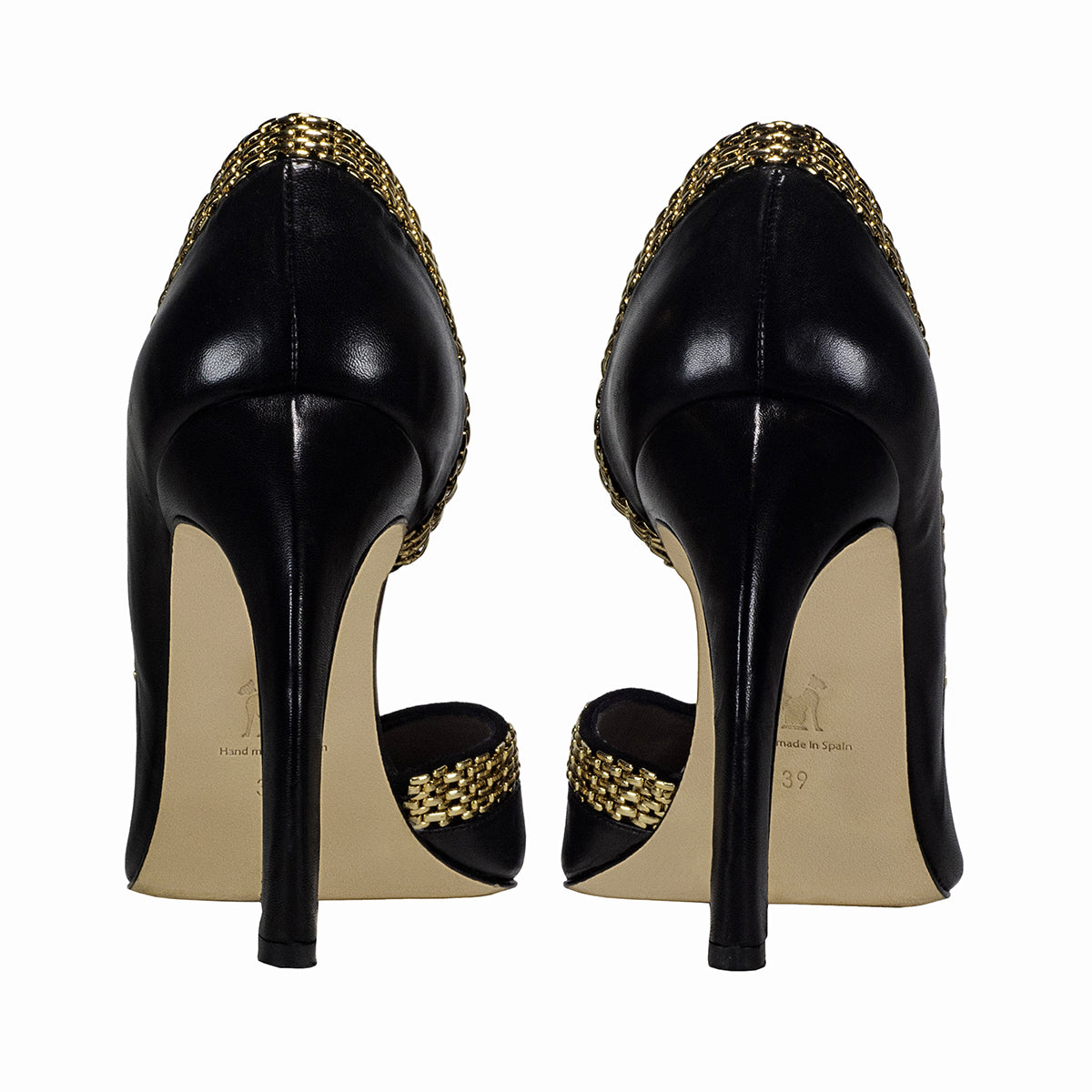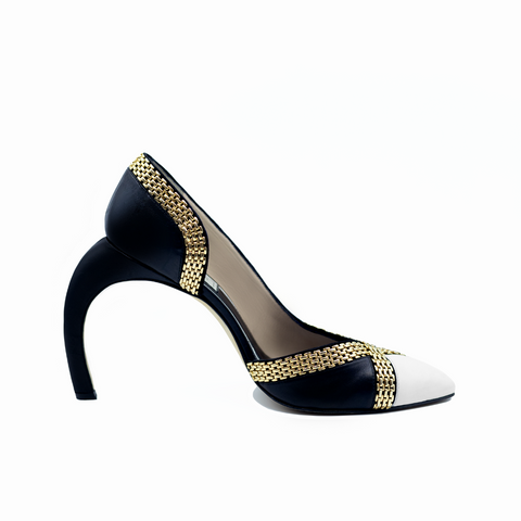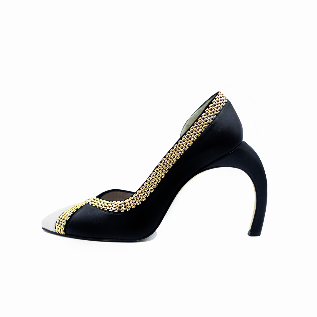 The elegant ‘Talon Curvée’ heel embellishes the grace of a Sphinx cat, seducing as much by it’s audacious behavior as by it’s new allure. This 100% Leather heel with Metal chain will host sophistication and irony like two house guests that don’t get on very well.